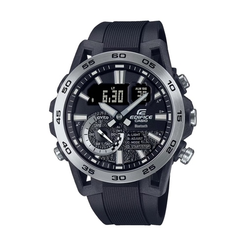 Перед вами супер стильная модель EDIFICE из аналого-цифровой серии Edifice ECB в свежем карбоновом корпусе ECB-40 черного цвета. Модель получила обновленный динамичный дизайн с визуальными отсылками к автомобильному спорту: необычная узнаваемая конструкция корпуса выполнена в стилистике подвесок в формульных гонках, где колеса болида крепятся к шасси на карбоновых лучах. Стальной безель и прочное минеральное стекло защищает лаконичный темный циферблат от внешних повреждений, а контрастные стрелки и метки обеспечивают высокую эргономику модели. Автомобильное ДНК модели пронизывает практически каждую деталь в оформлении: нижняя часть циферблата получила текстуру покрытия гоночной трассы, а субциферблат у семи часов — паттерн финишного флага. Под капотом у данных эдифисов: технология Bluetooth®, позволяющая синхронизировать часы со смартфоном, высокоточный секундомер с шагом 1/1000 секунды, привычная для часов Edifice водозащита 100 метров, двойная светодиодная подсветка и еще около десятка часовых функций. Напоминаем, что серия ECB — это небольшая аналого-цифровая серия Edifice, модели которой отличает технологичность и узнаваемый внешний вид.