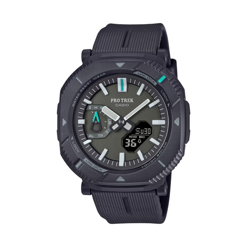 Перед вами релиз 2024 года — новая аналого-цифровая серия PRO TREK PRJ-B001 в черном полимерном корпусе на полимерном ремешке с бирюзовыми деталями циферблата. В отличие от предыдущих серий PRO TREK, которые создавались для хайкинга и серьезных горных восхождений, обладали обширным функционалом и датчиками, новая серия PRJ-B001 создана для трекинга и менее экстремальных условий, ее основная концепция легкость и удобство на запястье. Именно поэтому вес модели составил впечатляющие 44 грамма.