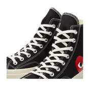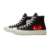 Всего было выпущено две вариации, черная и светлая кремовая. За основу взята высокая версия классики от Converse. Эти кеды сохраняют строгие цвета, добавляя в них изюминку в виде красного сердца с глазами, которое буквально выглядывает из-под задней части края подошвы.